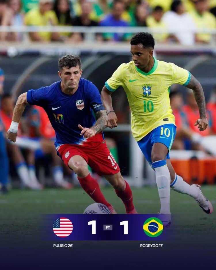 友谊赛-巴西1-1美国 拉菲尼亚助攻罗德里戈破门普利西奇扳平