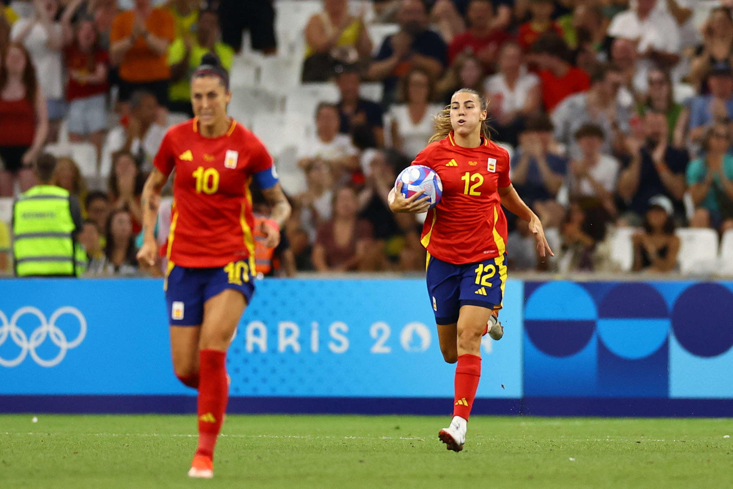 西班牙女足首发:13-卡特琳娜、2-奥娜-巴特勒、4-帕雷德斯、16-柯蒂娜、18-奥尔加、6-邦马蒂、3-特蕾莎、10-埃尔莫索、15-艾娃-纳瓦罗、8-马里奥纳、9-帕拉卢洛