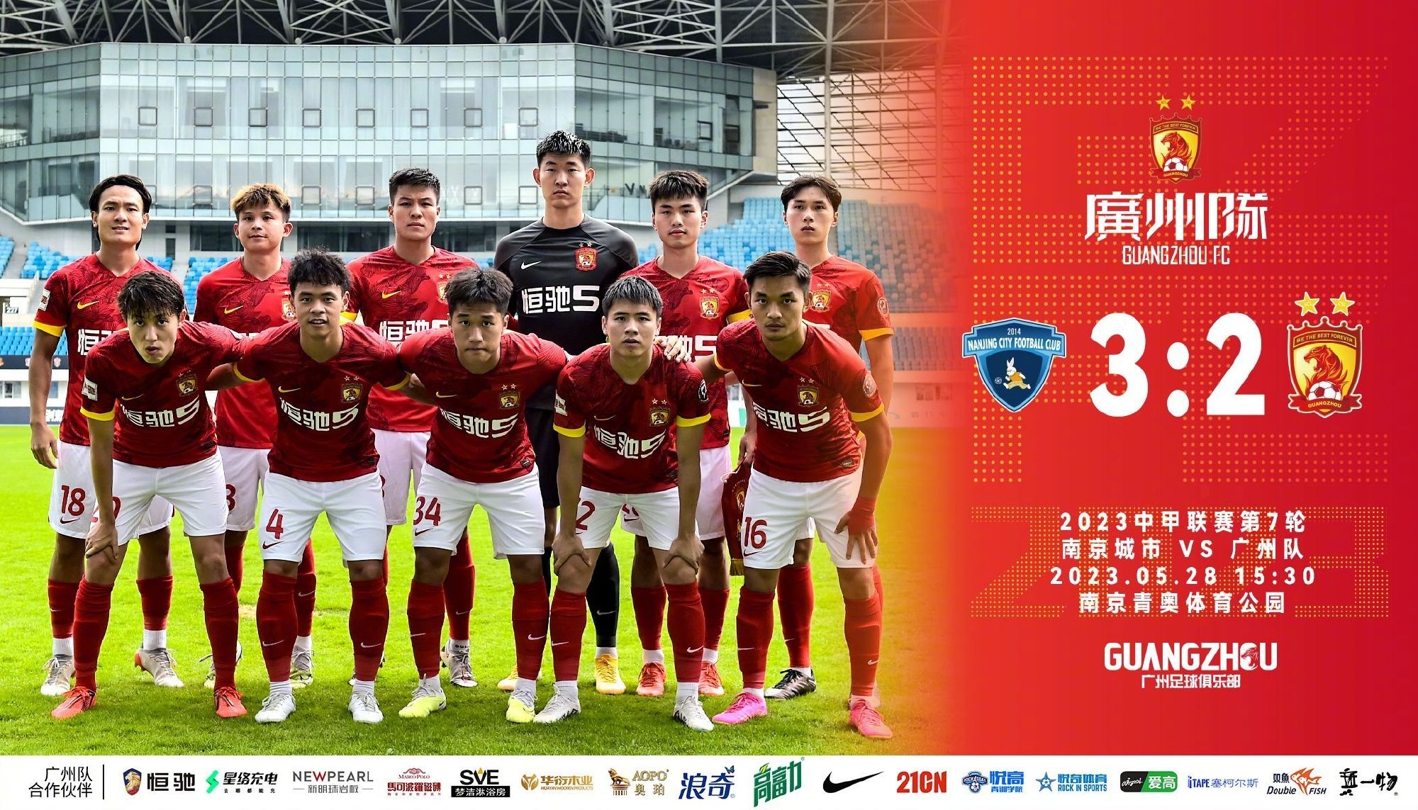 最终,南京城市3-2战胜广州。