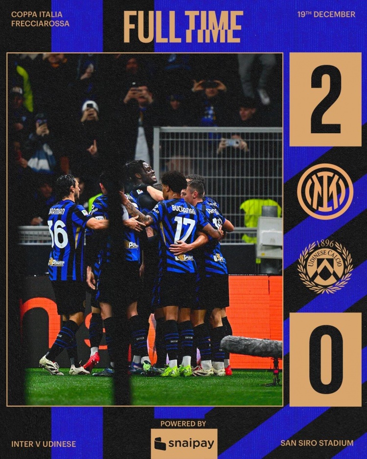 12月20日讯 意大利杯第3轮,国际米兰坐镇梅阿查主场迎战乌迪内斯。上半场,塔雷米助攻阿瑙托维奇先拔头筹,阿斯拉尼角球直接破门。易边再战,塔雷米单刀中柱,劳塔罗错失良机。最终国米2-0乌迪内斯晋级八强,下轮将对阵拉齐奥。