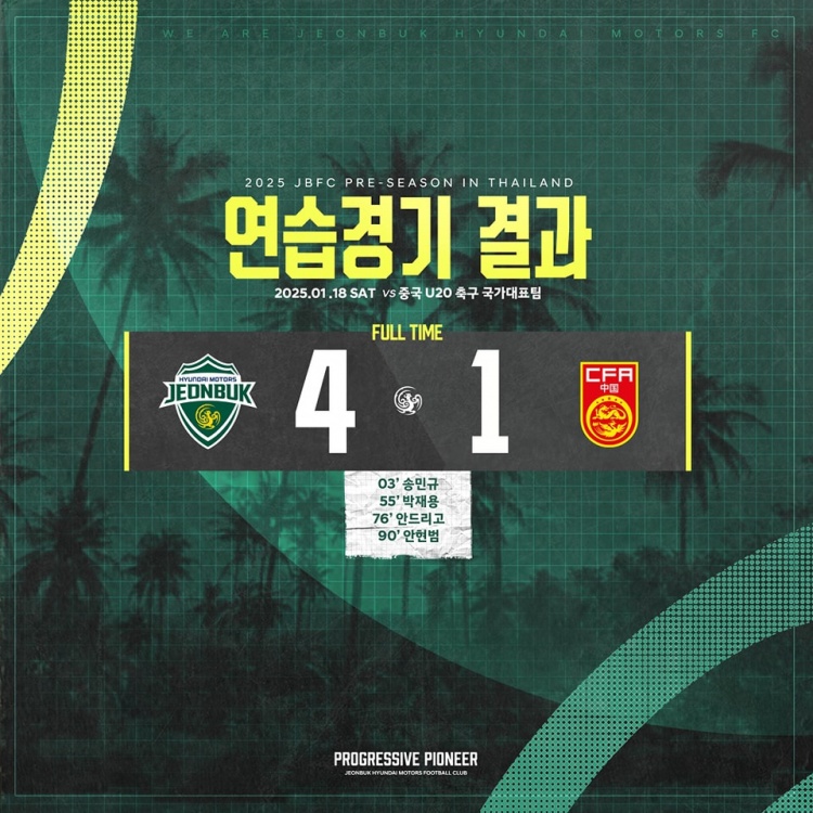 U20国青上下半场各排出一套阵容对战全北现代,由于对方是一线队出战,双方实力存在差距,全北现代在比赛第3分钟、55分钟、76分钟、90分钟分别进球,最终U20国青1-4不敌韩国全北现代,张志雄65分钟任意球为U20国青打进一球。
