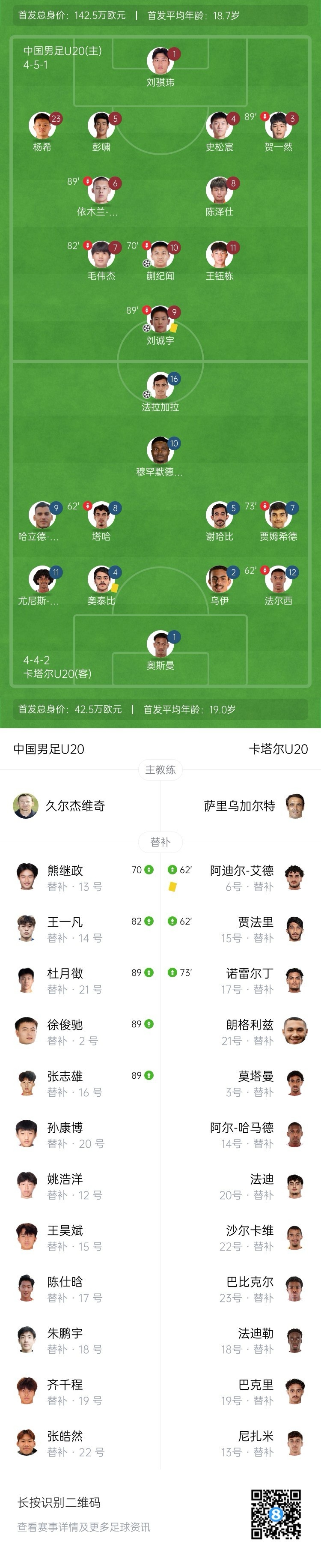 开门红!国青2-1完胜卡塔尔 蒯纪闻&刘诚宇破门卡塔尔全场1射正