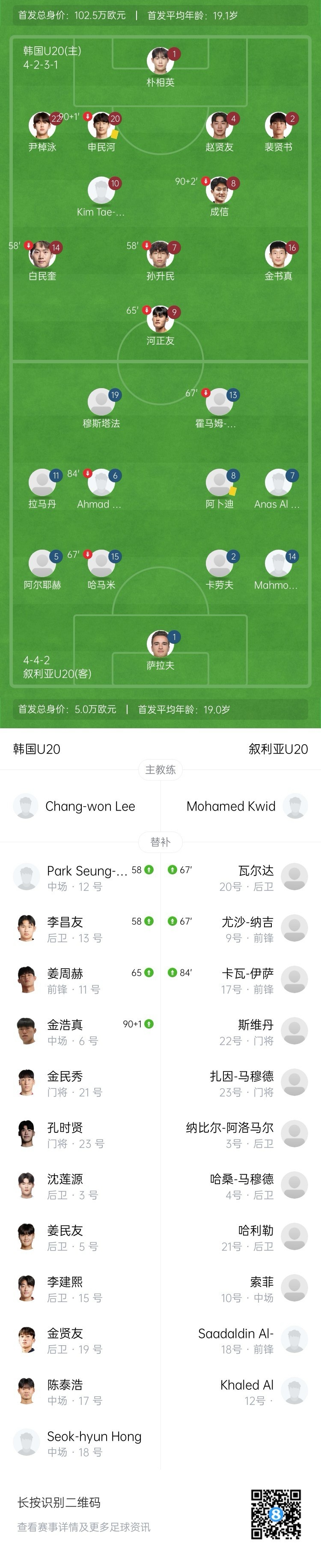 第23分钟,韩国U20队再下一城,成信助攻,白民奎小角度左脚抽射远角得手,韩国U20队2-0领先叙利亚U20队。↓