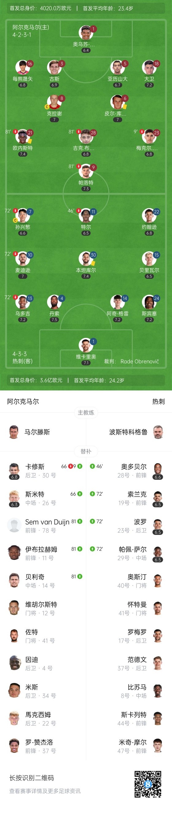 下半场补时3分钟,阿尔克马尔1-0热刺。