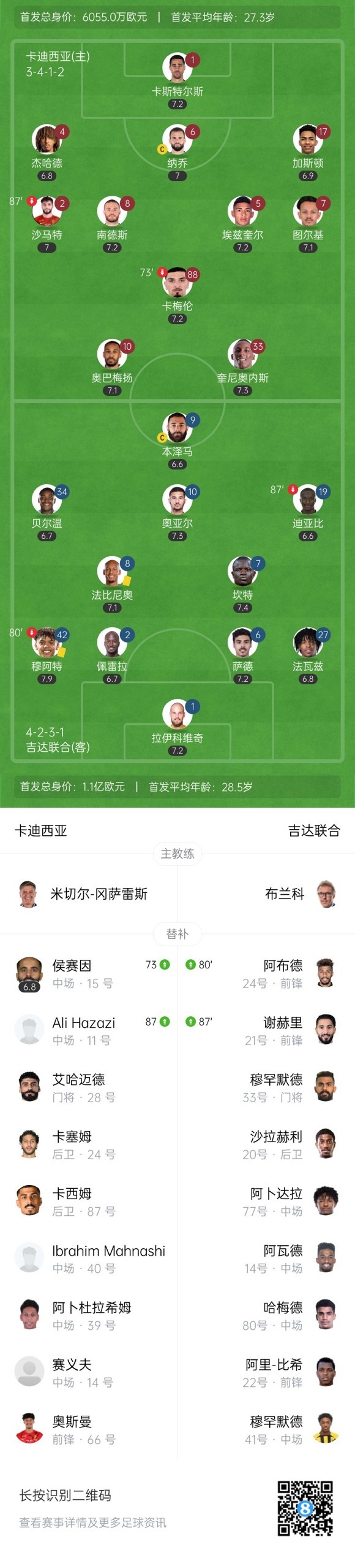 下半场补时5分钟,卡迪西亚1-1吉达联合。