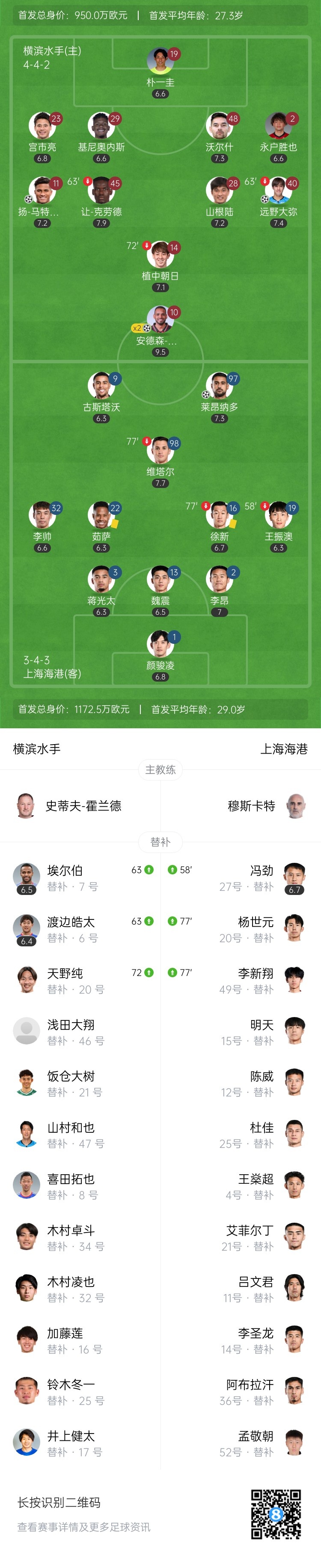 第2分钟,徐新中路出球被断,远野大弥杀入禁区内低射破门!1-0!横滨水手带球入场!↓