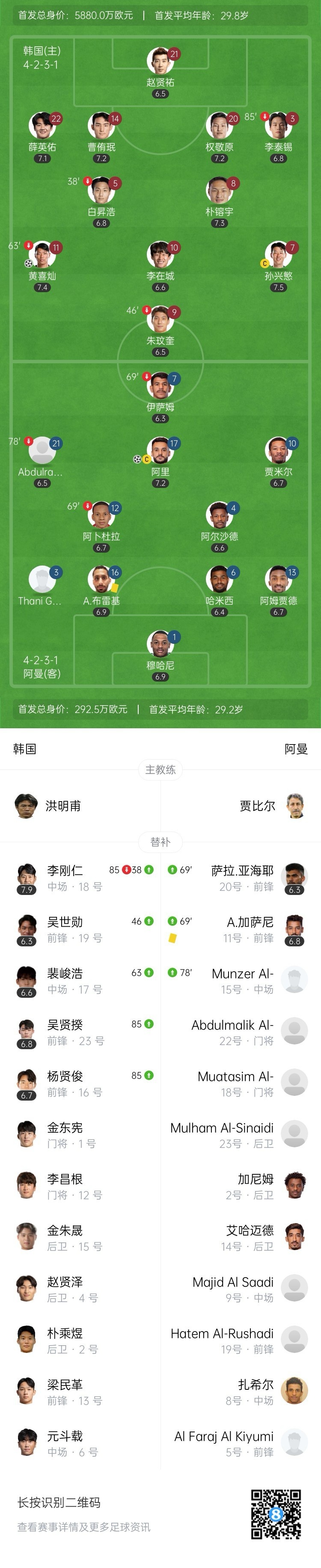 3月20日讯 北京时间3月20日19:00,世预赛亚洲区18强赛B组第7轮,韩国队主场对阵阿曼队。上半场,白昇浩伤退,李刚仁替补登场助攻黄喜灿破门;下半场,布赛迪远射扳平比分。李刚仁伤退。最终,韩国队1-1战平阿曼队,7战积15分,先赛一场4分领跑,阿曼队积7分位列小组第四位。