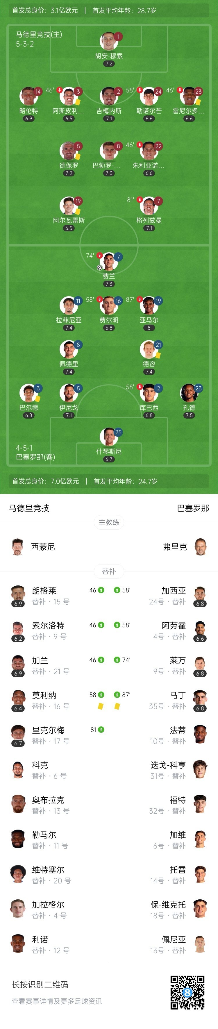 第21分钟,亚马尔内切摆脱后直传,佩德里再脚后跟做球,马竞解围失误,拉菲尼亚和亚马尔两连击错失良机。↓