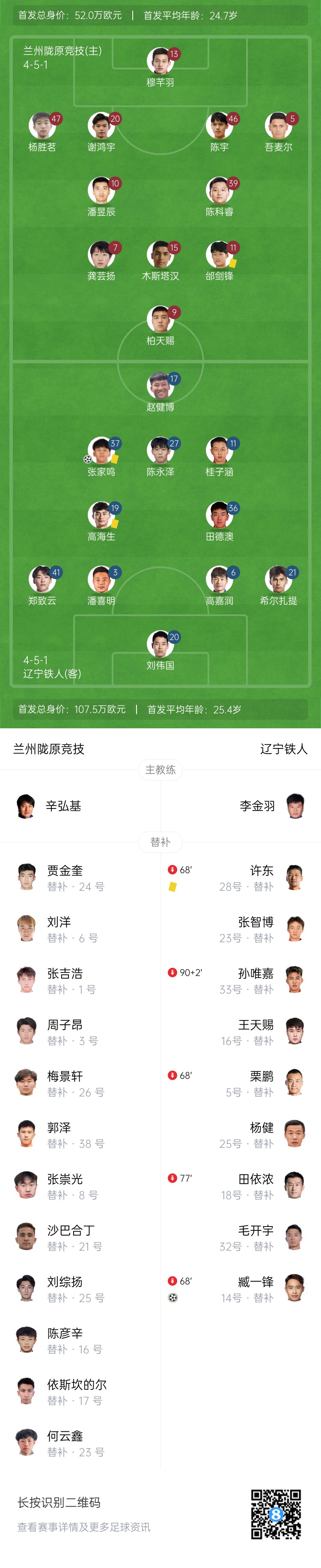伤停补时5分钟。全场比赛结束,兰州陇原竞技0-2辽宁铁人。