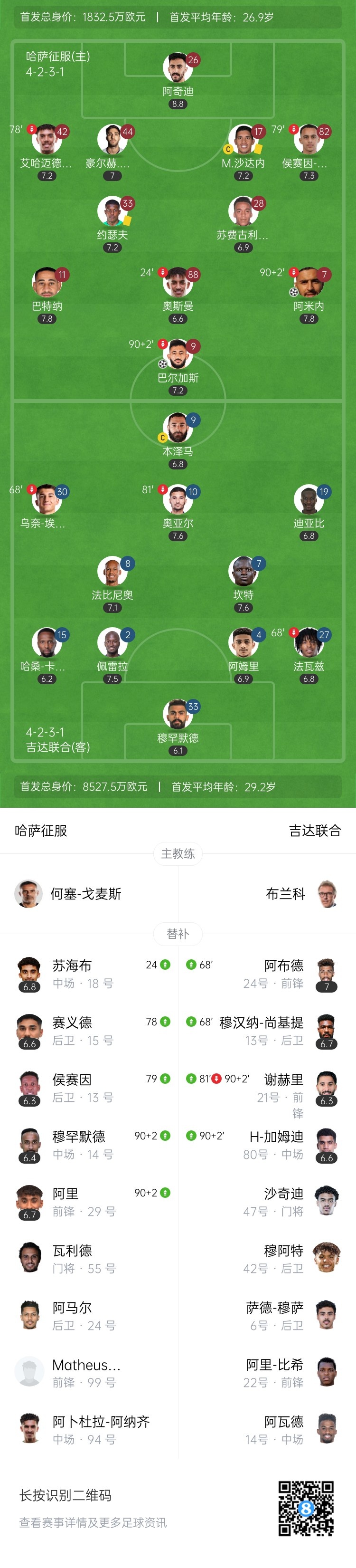 第10分钟,巴特纳突入禁区横传,阿米内-斯拜抽射破门!吉达联合0-1哈萨征服↓