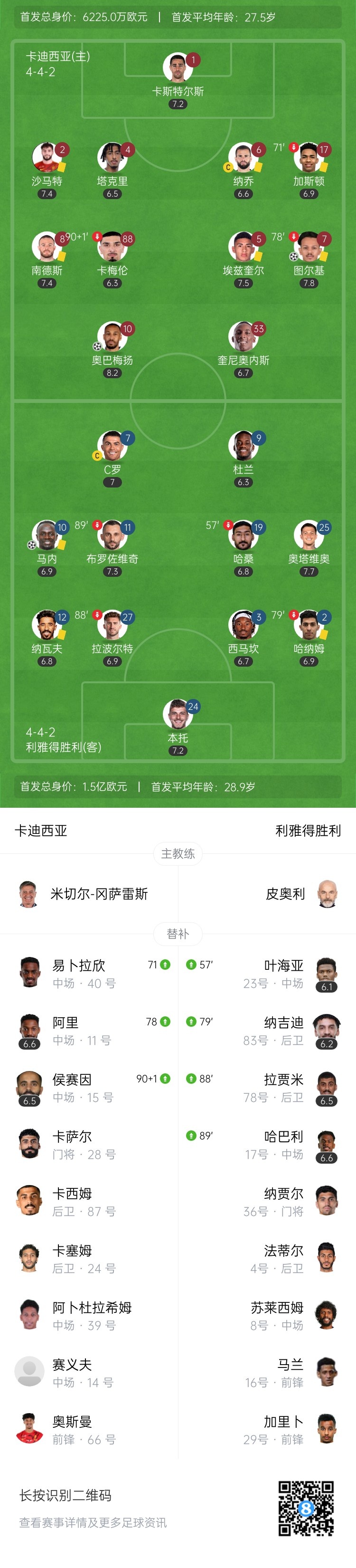 第84分钟,利雅得胜利中场断球反击!奥塔维奥长传直接找锋线,马内丝滑停球单刀破门!利雅得胜利1-1扳平卡迪西亚↓