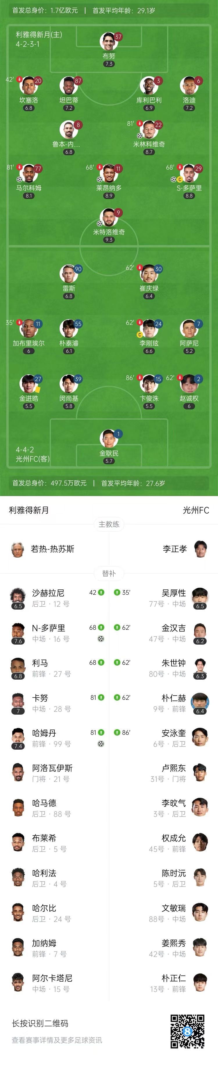 4月26日讯 北京时间4月26日0:30,亚冠精英联赛1/4决赛,利雅得新月坐镇阿卜杜拉国王体育场迎战光州FC。上半场,米林科维奇头槌首开记录,马尔科姆助攻莱昂纳多在下一城,多萨里单刀破门。下半场,米特洛维奇抢点破门后助攻马尔科姆再入一球,纳赛尔-多萨里、哈姆丹替补建功。全场比赛结束,利雅得新月7-0大胜光州FC,强势挺进四强。