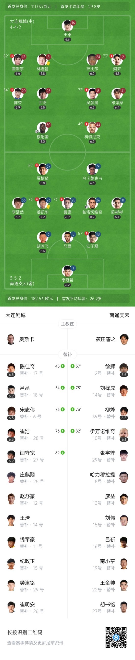 第78分钟,大连鲲城扳平比分!吕品禁区左路挑传门前马晟冒顶后穆谢奎抽射破门,大连鲲城1-1南通。↓