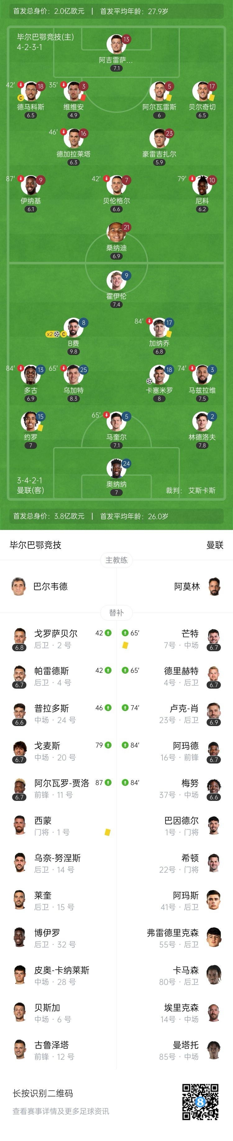 全场比赛结束,曼联首回合客场3-0完胜十人毕尔巴鄂竞技。