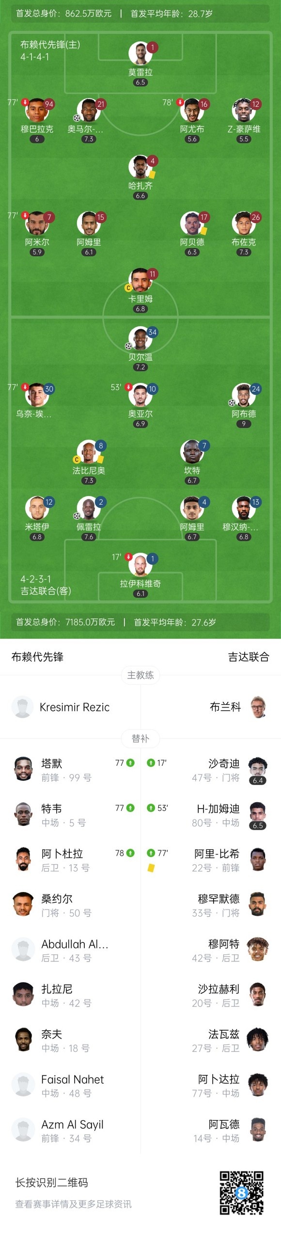 上半场补时5分钟,布赖代先锋1-2吉达联合。