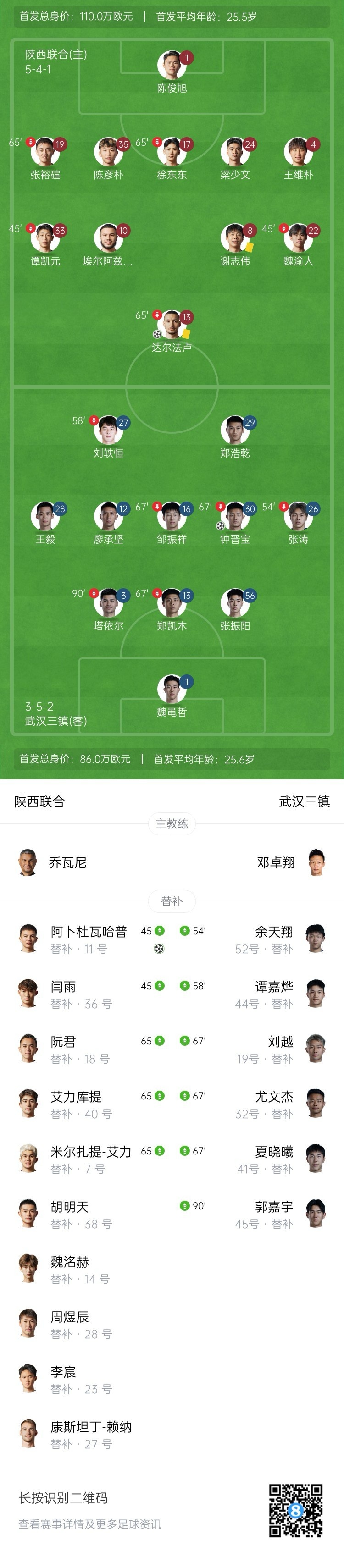全场比赛结束,陕西联合2-1逆转武汉三镇。