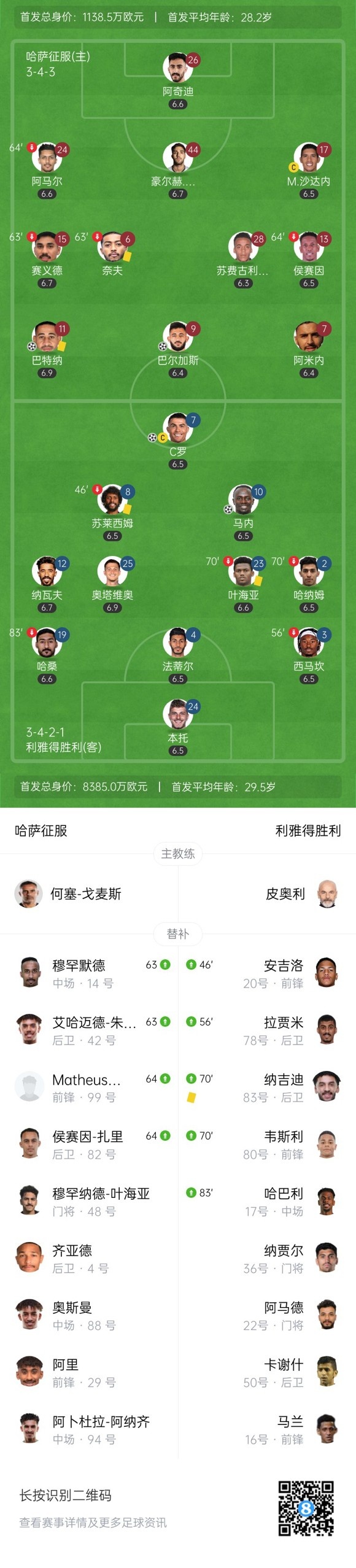 下半场补时9分钟,哈萨征服3-2利雅得胜利。