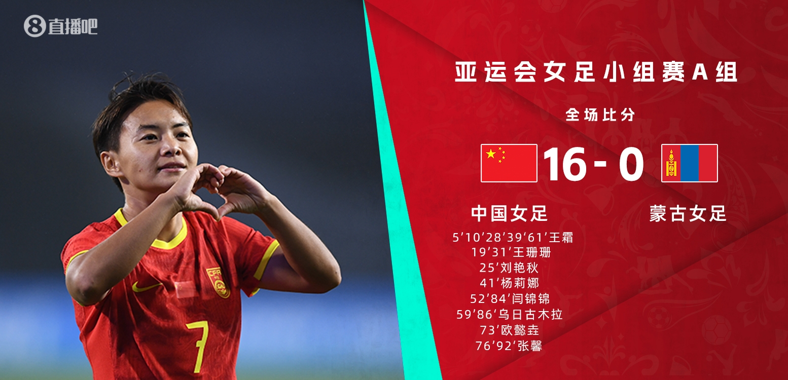 亚运女足-中国16-0蒙古平队史亚运历史分差纪录 王霜5射2传4人双响