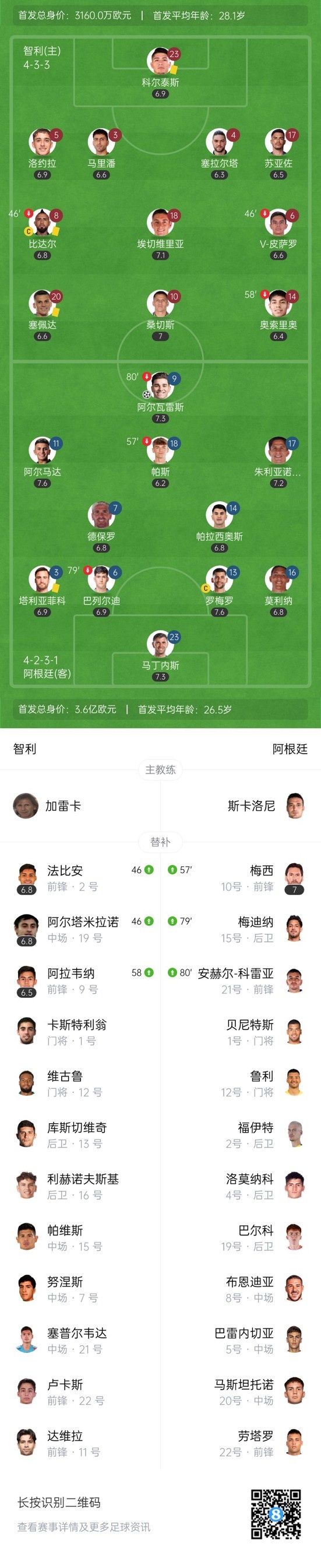 6月6日讯 北京时间6月6日09:00,世预赛南美区第15轮阿根廷挑战智利的比赛在智利国家体育场进行,上半场桑切斯开场远射造险,阿尔马达助攻阿尔瓦雷斯单刀破门首开记录,半场结束,阿根廷1-0智利。下半场梅西替补登场,塞佩达远射中楣,小西蒙尼失良机,最终阿根廷1-0智利取四连胜10分领跑。