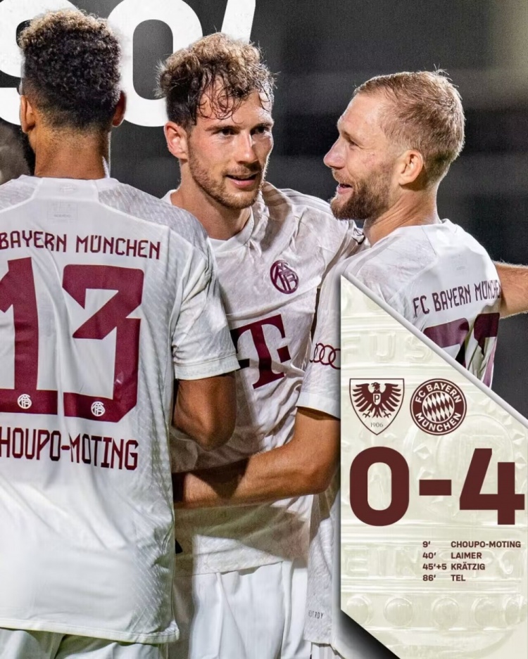 9月27日讯北京时间9月27日凌晨2:45,德国杯第1轮,拜仁客场对阵德丙球队普鲁士明斯特。上半场,舒波-莫廷破门为拜仁首开纪录,格纳布里伤退,莱默尔、克雷茨格连入两球扩大比分优势;下半场,萨尔助攻特尔再下一城锁定胜局!全场比赛结束,拜仁慕尼黑4-0普鲁士明斯特!