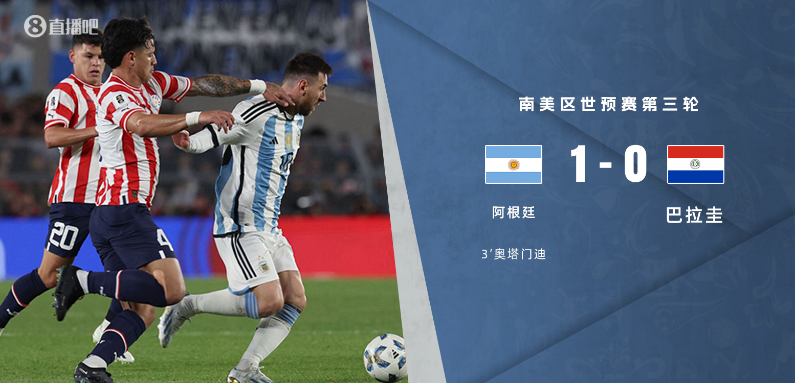 10月13日讯 北京时间10月13日07:00,世预赛南美区阿根廷对阵巴拉圭的比赛,上半场德保罗助攻奥塔门迪凌空斩闪击得手,劳塔罗失良机德保罗中柱,半场结束,阿根廷1-0巴拉圭。下半场梅西替补出场角球+任意球中柱,最终阿根廷1-0巴拉圭三连胜暂升榜首。