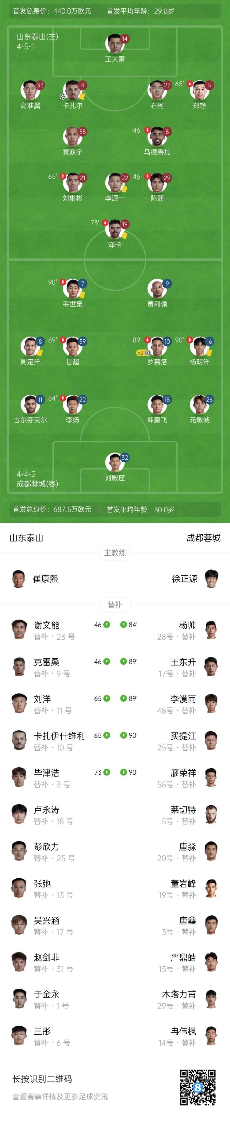 下半场,泰山队调兵遣将,谢文能和克雷桑替补登场。↓
